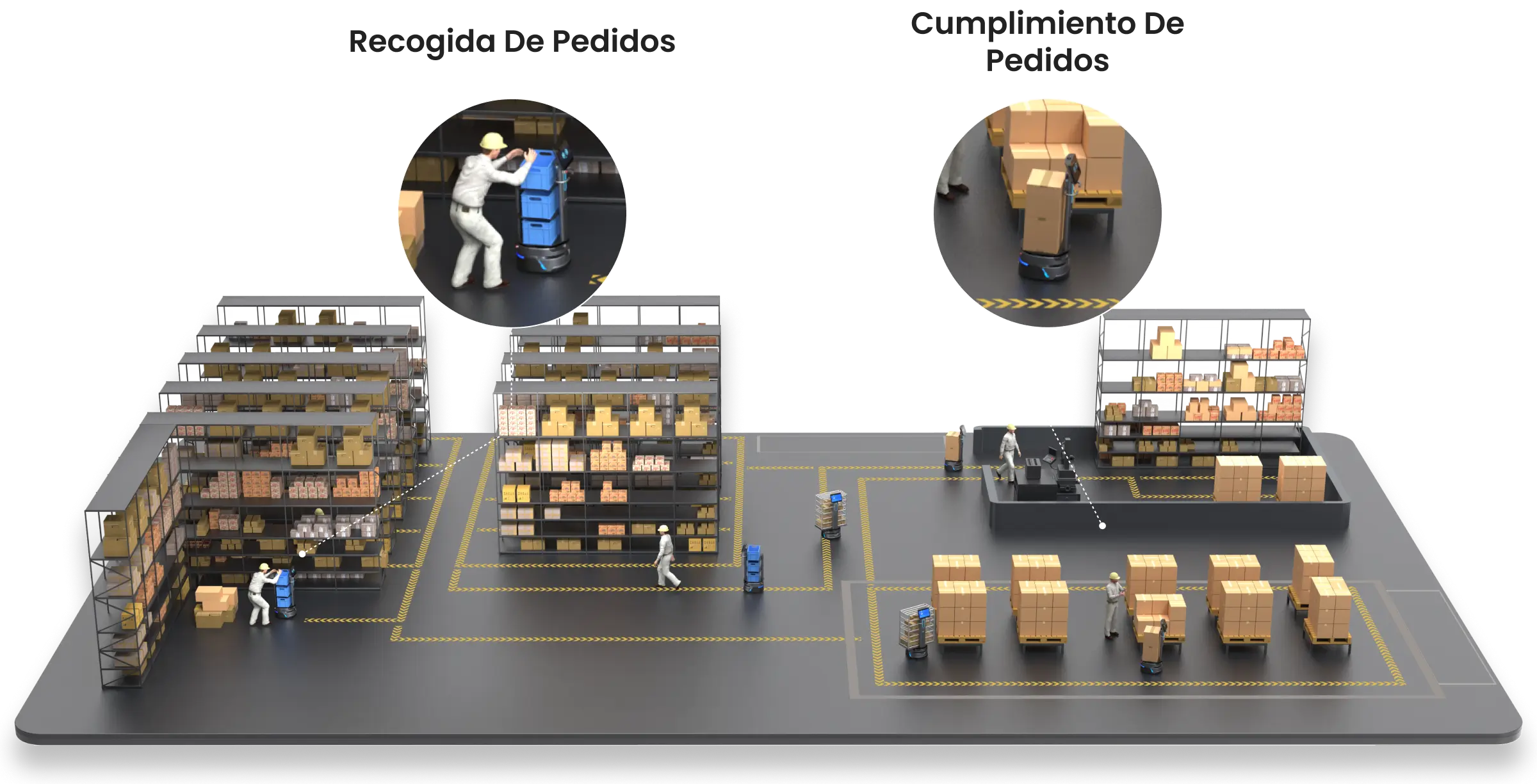 Los robots pueden visitar uno o varios puntos de recogida en un solo viaje, tomar la ruta más corta y dirigirse directamente al área de envío.