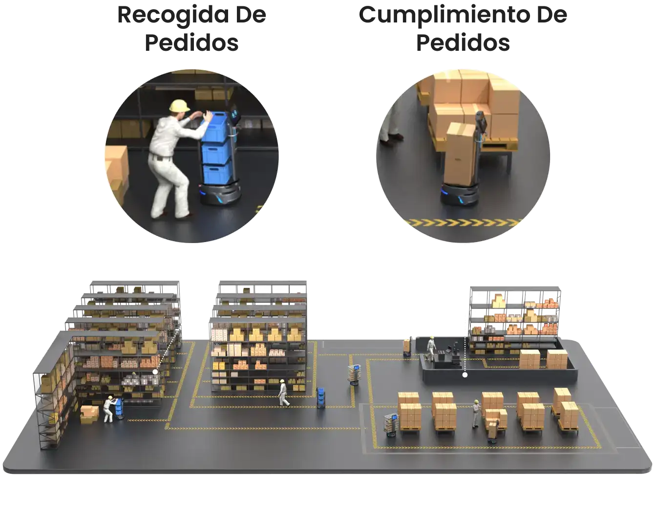 Diseñados para una operación continua, los robots viajan incansablemente entre el almacén y el área de envío, asegurando un cumplimiento constante de pedidos.